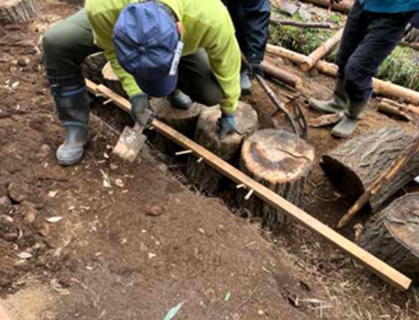 地権者さんにいただいた間伐材で再建、小楢の丸太スツール形ベンチを作りました。